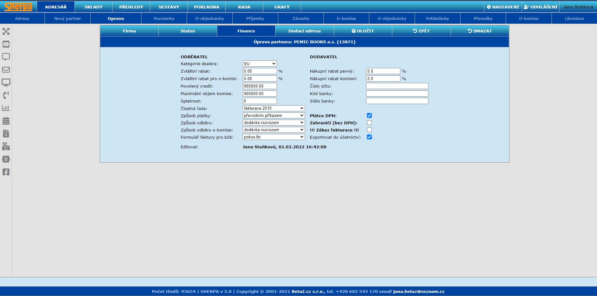 Málokdo si to asi uvědomí, ale je základním pilířem každého informačního systému. Slouží k evidenci, filtrování a přehledu všech obchodních partnerů a to jak dodavatelů, tak odběratelů, dopravců a i koncových zákazníků jak na prodejně tak i v e-shopu a B2B systému. Navíc modul přehledně sdružuje všechny informace o partnerovi a to jak kontaktní údaje, tak ekonomické informace ( pohledávky, závazky, rabatové podmínky, poznámky k partnerovi ) a v neposlední řadě přehled jeho zboží. Co určitě každého uživatele potěší je, že systém je schopen načíst údaje o partnerovi se systému ARES, takže budete mít aktuální údaje ze všech rejstříků.