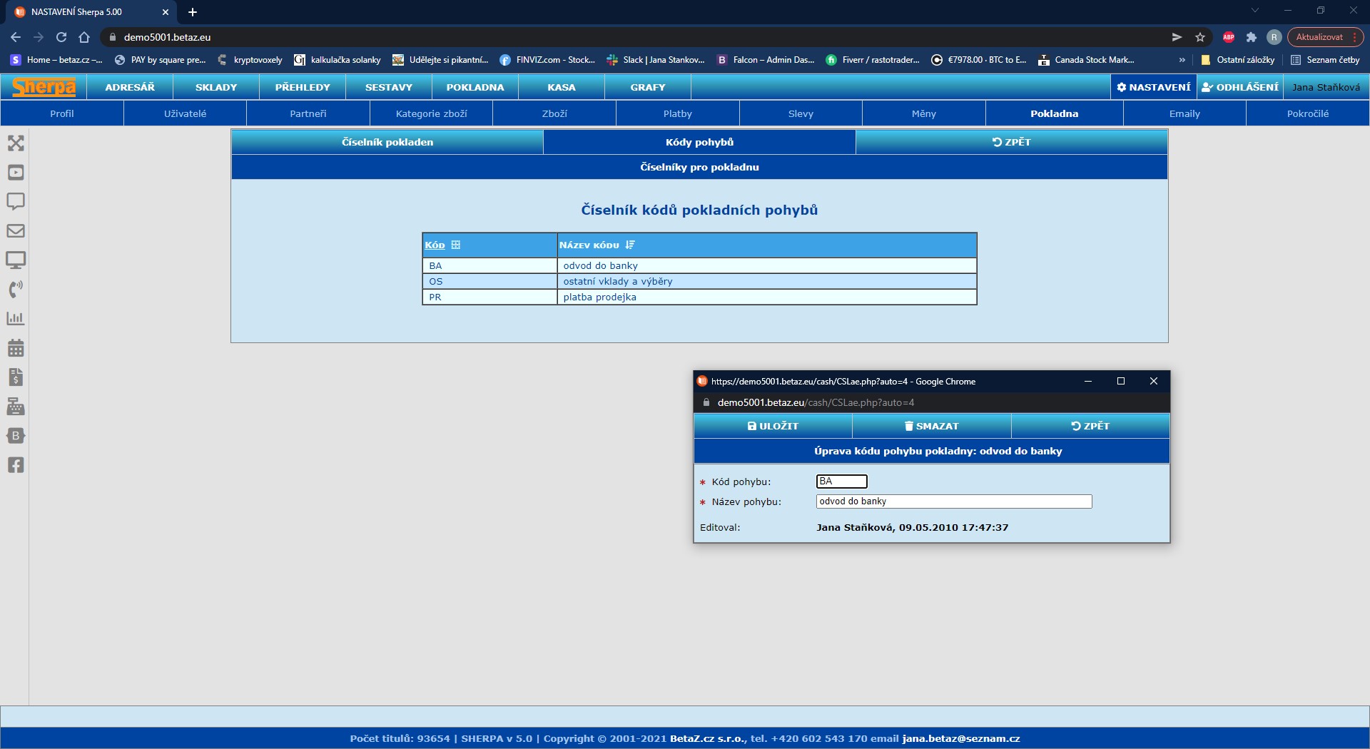 Nastavení číselníků – Pokladna