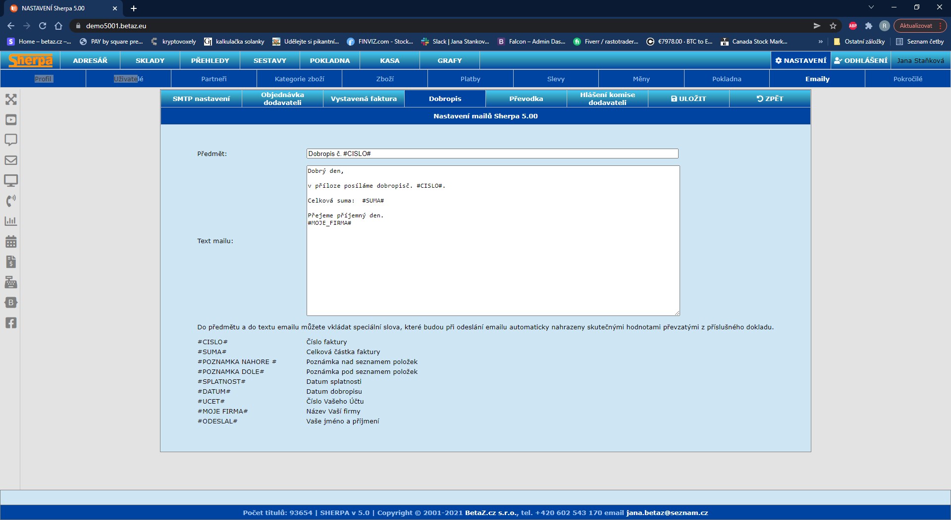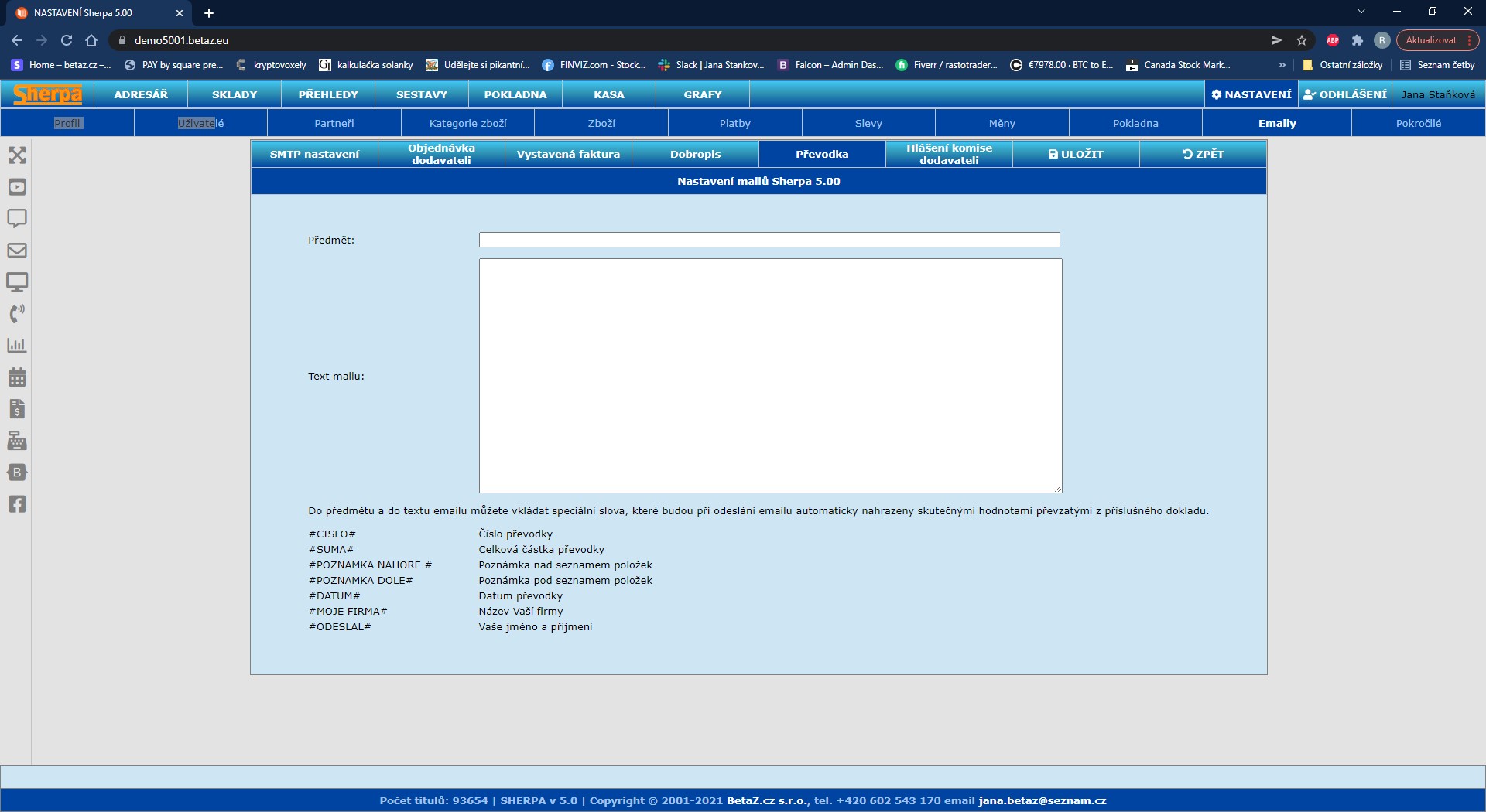 Systém umožňuje odesílat emaily pro určité druhy dokladů napřímo a to jak v PDF, tak v CSV, anebo TXT formátech. Jedná se o doklady jako Objednávky, Faktura, Dobropis, Převodka a Hlášení komise. Pro každý typ dokladu si můžete před nastavit Předmět a text emailu a povolené proměnné, které budou nahrazeny aktuálními údaji dokladu. V sekci SMTP nastavení je nutno nastavit základní údaje k odesílaní, to znamená jestli bude email odesílaný z SMTP serveru SHERPA, anebo použijete vlastní SMTP server kde vedete svůj emailový účet.