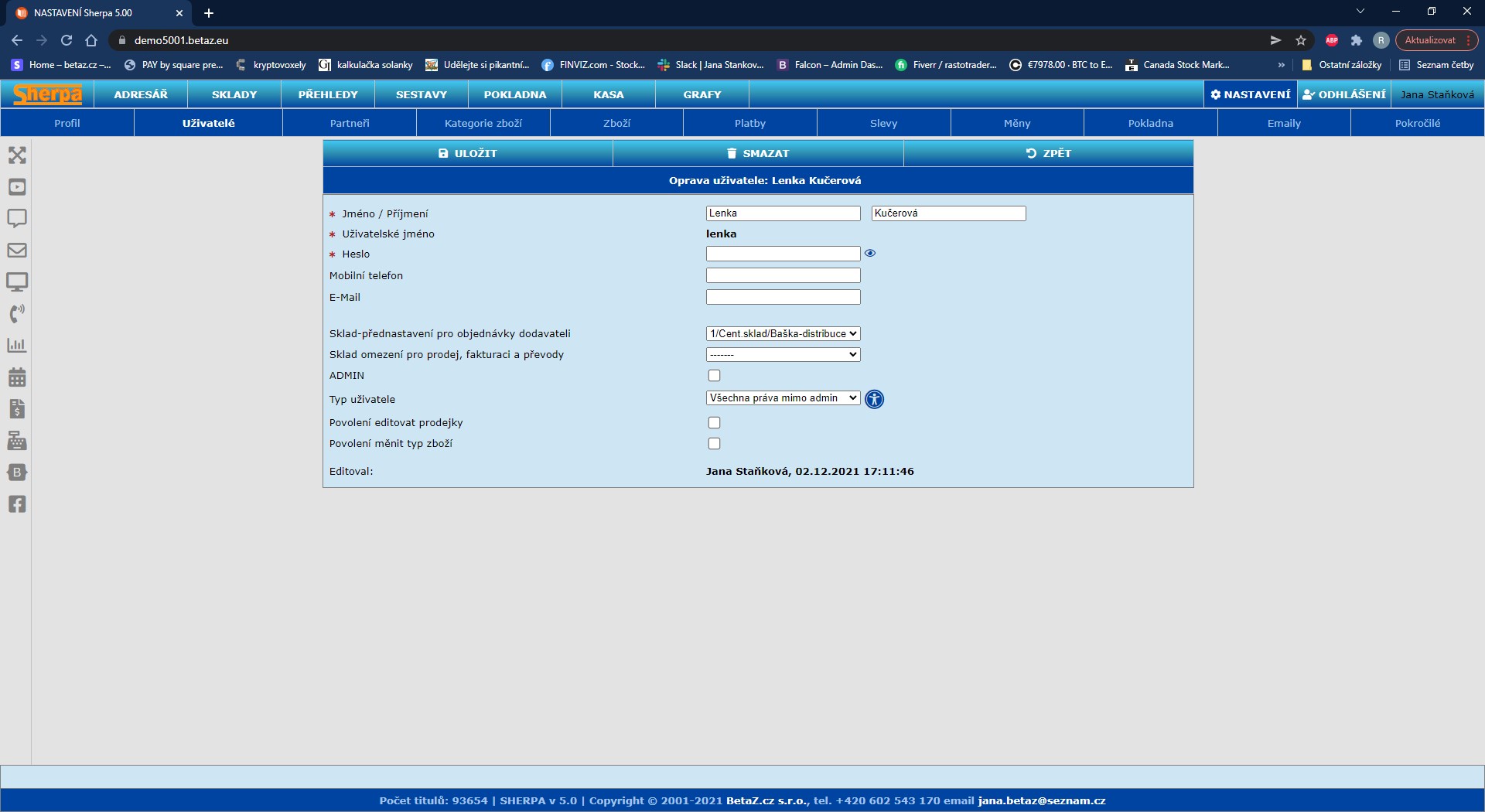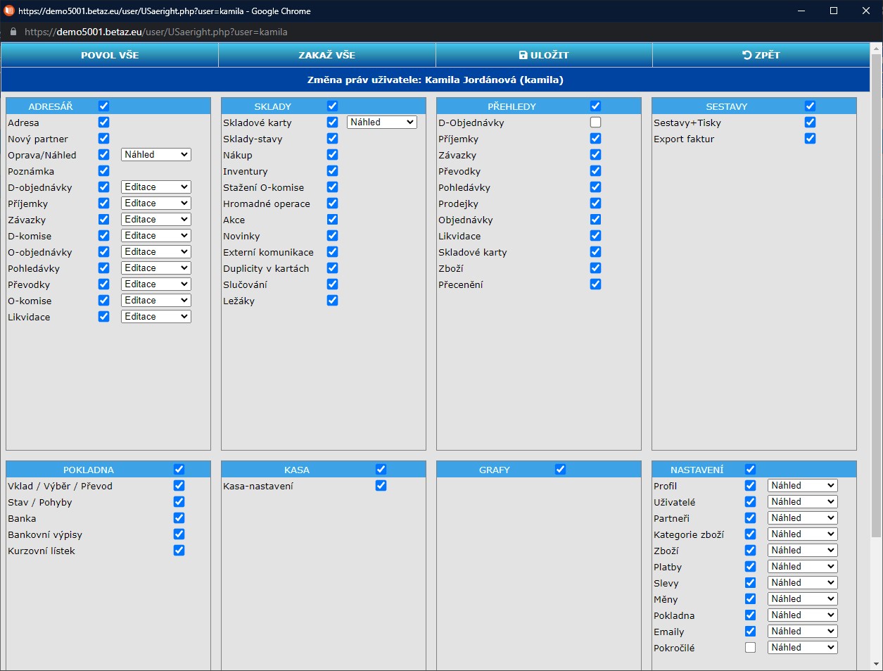 Nastavení uživatelů, umožňuje velice podrobné nastavení přístupových práv k jednotlivým modulům a specifikaci co může a co nemůže konkrétní uživatel dělat.